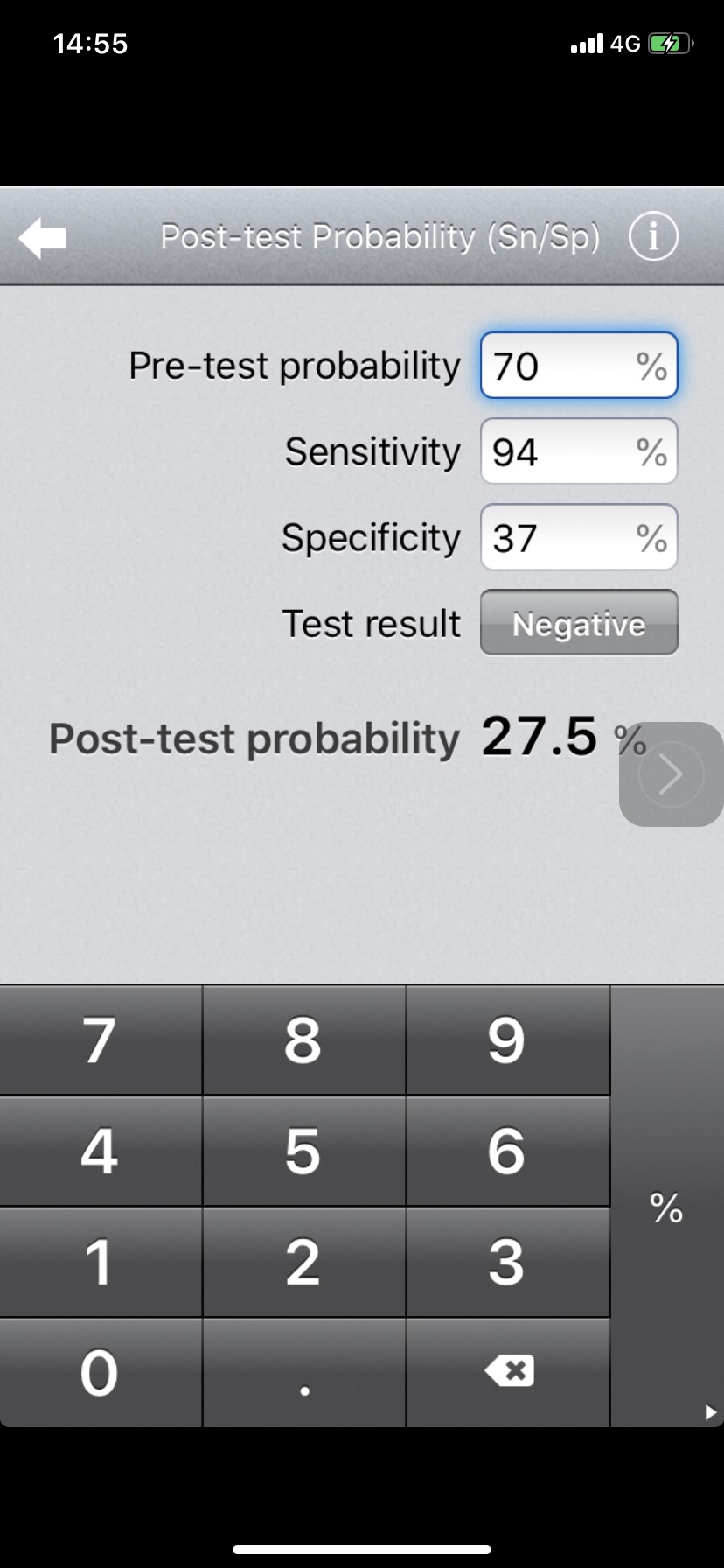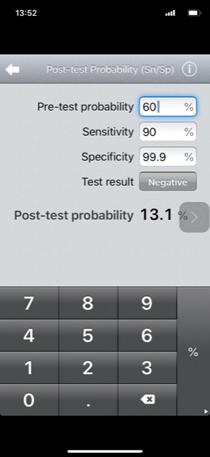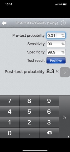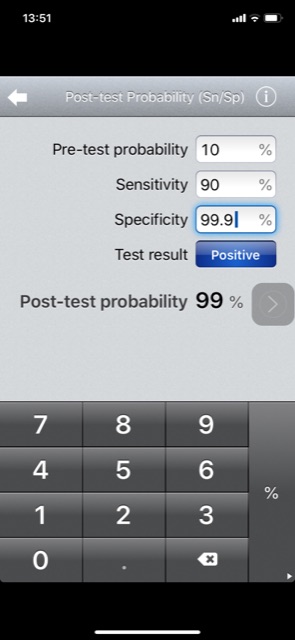 上述の「オッズ」で計算するのはめんどくさいので、手元のスマホに計算させました。すると事後確率は99%となります。ほぼCOVID-19確定ですね。